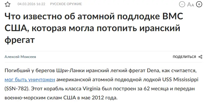 Четвертого марта с.г. иностранные СМИ сообщили о потоплении американской ударной ПЛА класса «Вирджиния» (предположительно USS «Миссисипи» SSN-782) у берегов Шри-Ланки фрегата ВМС Ирана «Дена», возвращающегося с международных учений с индийскими ВМС.