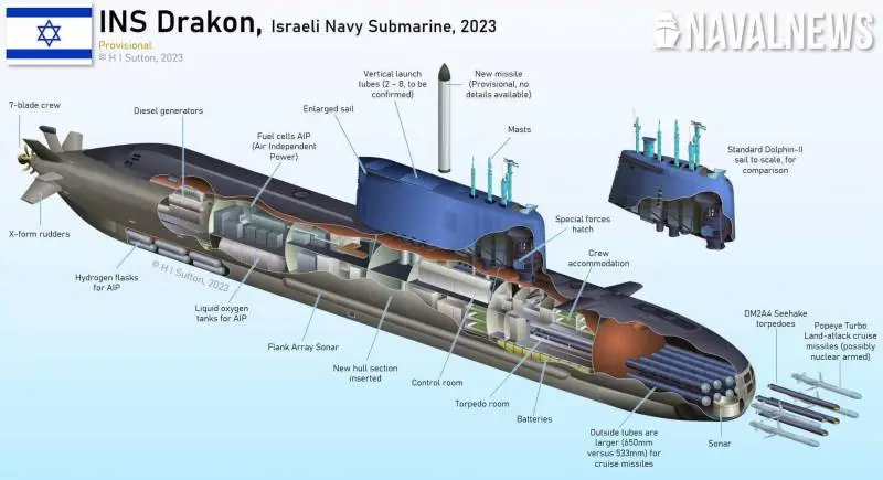 Зарубежные аналитики полагают, что израильтяне для своих перспективных ПЛ класса «Дракар» создали новый ракетный комплекс морского базирования, который установили на ПЛ INS «Дракон» (переходном варианте к перспективным «Дакарам»). В ходе боевых действий вполне возможно его боевое применение в неядерном оснащении. При этом одна-две из загруженных на лодку ракет вполне могут быть и в ядерном оснащении.