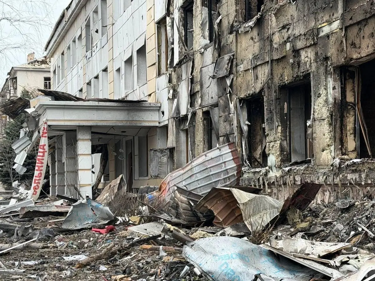 На другой фотографии, сделанной внутри здания, виден масштаб повреждений в одном из коридоров лечебного учреждения. Остатки уничтоженных окон валяются на полу, с потолка свисают фрагменты конструкций.