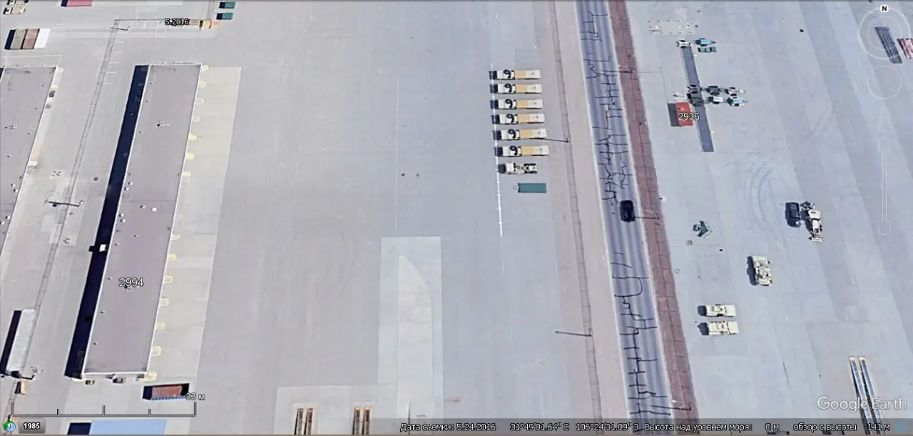 Спутниковый снимок Google Earth: самоходные пусковые установки системы THAAD в Форт-Блисс. Снимок делан в мае 2016 года