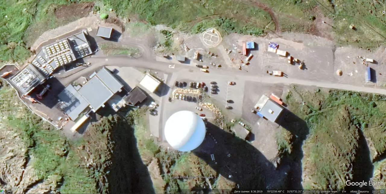Спутниковый снимок Gооglе Еаrth: элементы радарного комплекс EISCAT на Шпицбергене. Снимок сделан в июле 2023 года