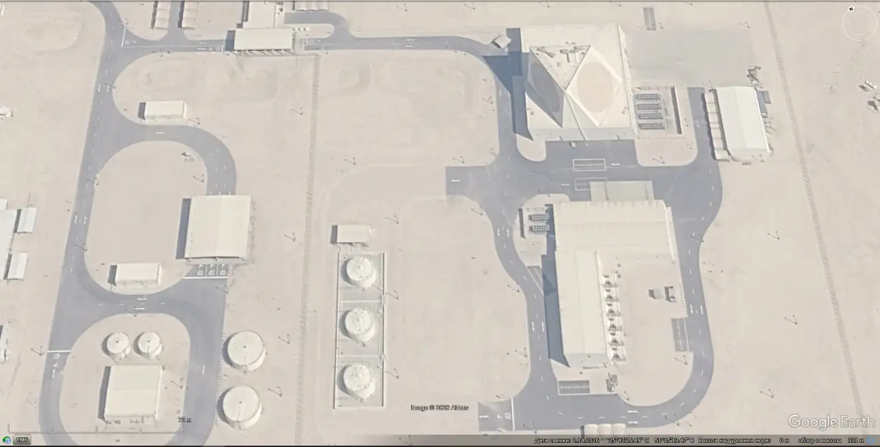 Спутниковый снимок Gооglе Еаrth: РЛС AN/FPS-132 в 1 км южней авиабазы Равдат-Хатан в Катаре. Снимок сделан 14 февраля 2026 года