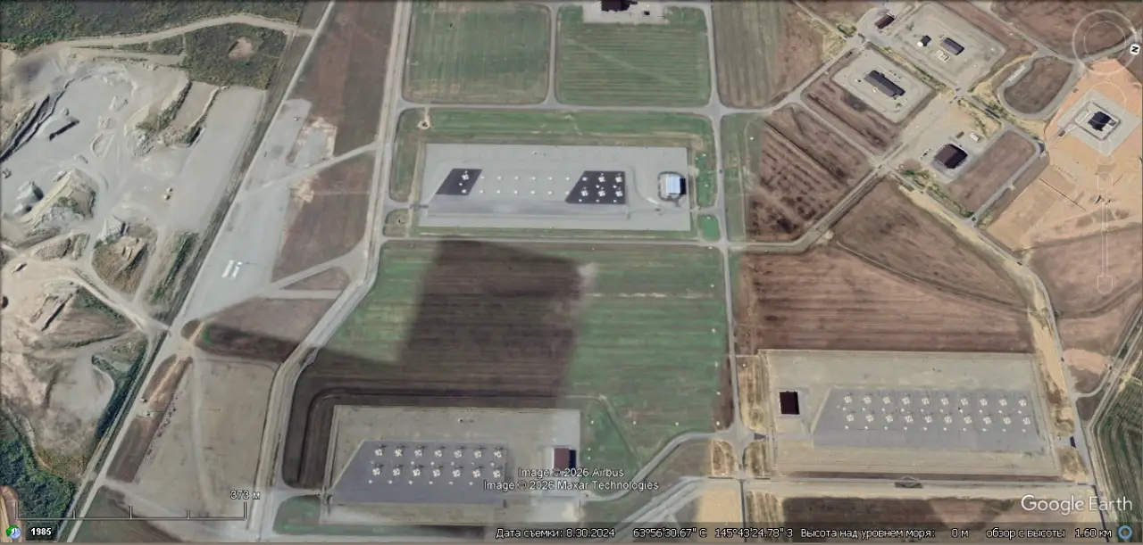 Спутниковый снимок Google Earth: шахтные пусковые установки противоракет GBI на территории базы Форт-Грили. Снимок сделан в августе 2024 года