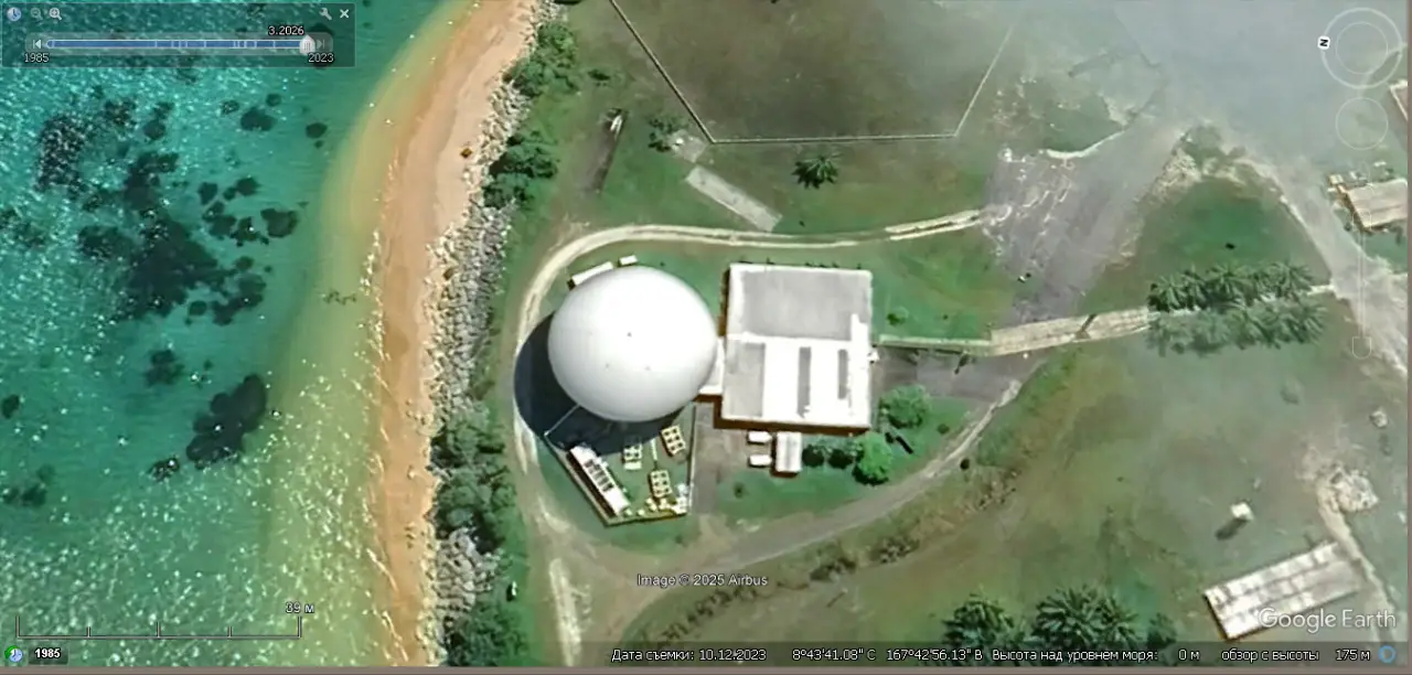 Спутниковый снимок Gооglе Еаrth: РЛС GBR-P на атолле Кваджалейн. Снимок сделан в октябре 2023 года