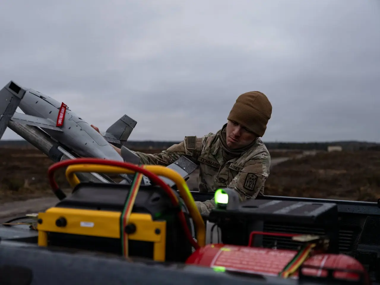 Система Merops на американо-польских учениях, ноябрь 2025 г. На автомобиле смонтирована пусковая установка с БПЛА. Рядом стоит РЛС типа MHR