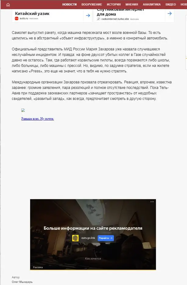 Официальный представитель МИД России Мария Захарова уже назвала случившееся неслучайным инцидентом. И правда: на фоне двухсот убитых коллег в Газе случайностей давно не осталось. Там, где работают израильские пилоты, всегда поражаются либо школы, либо больницы, либо машины с прессой. Но, видимо, по задумке стратегов, если на жилете написано «Press», это еще не значит, что в тебя не нужно стрелять.