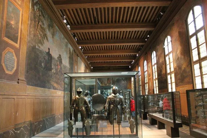 Один из рыцарских залов Музея армии в Париже. Впечатляет, рассматривать их удобно, но из-за расположения окон фотографировать практически невозможно, так сильно бликуют стекла витрин