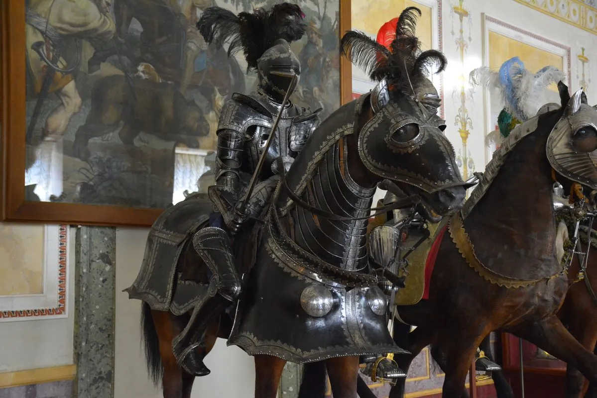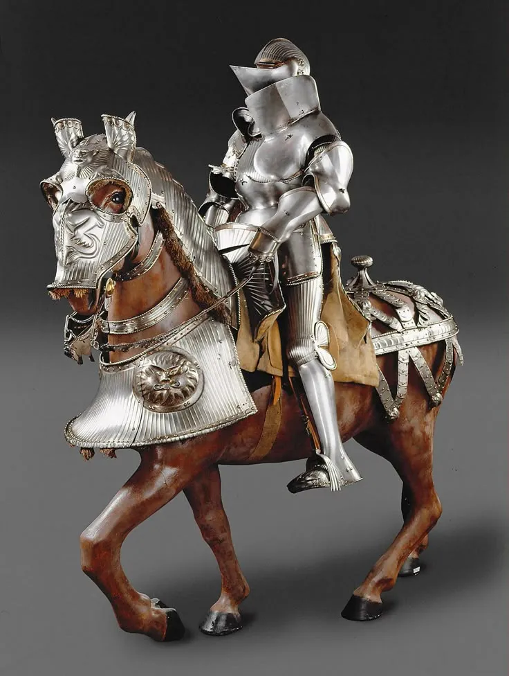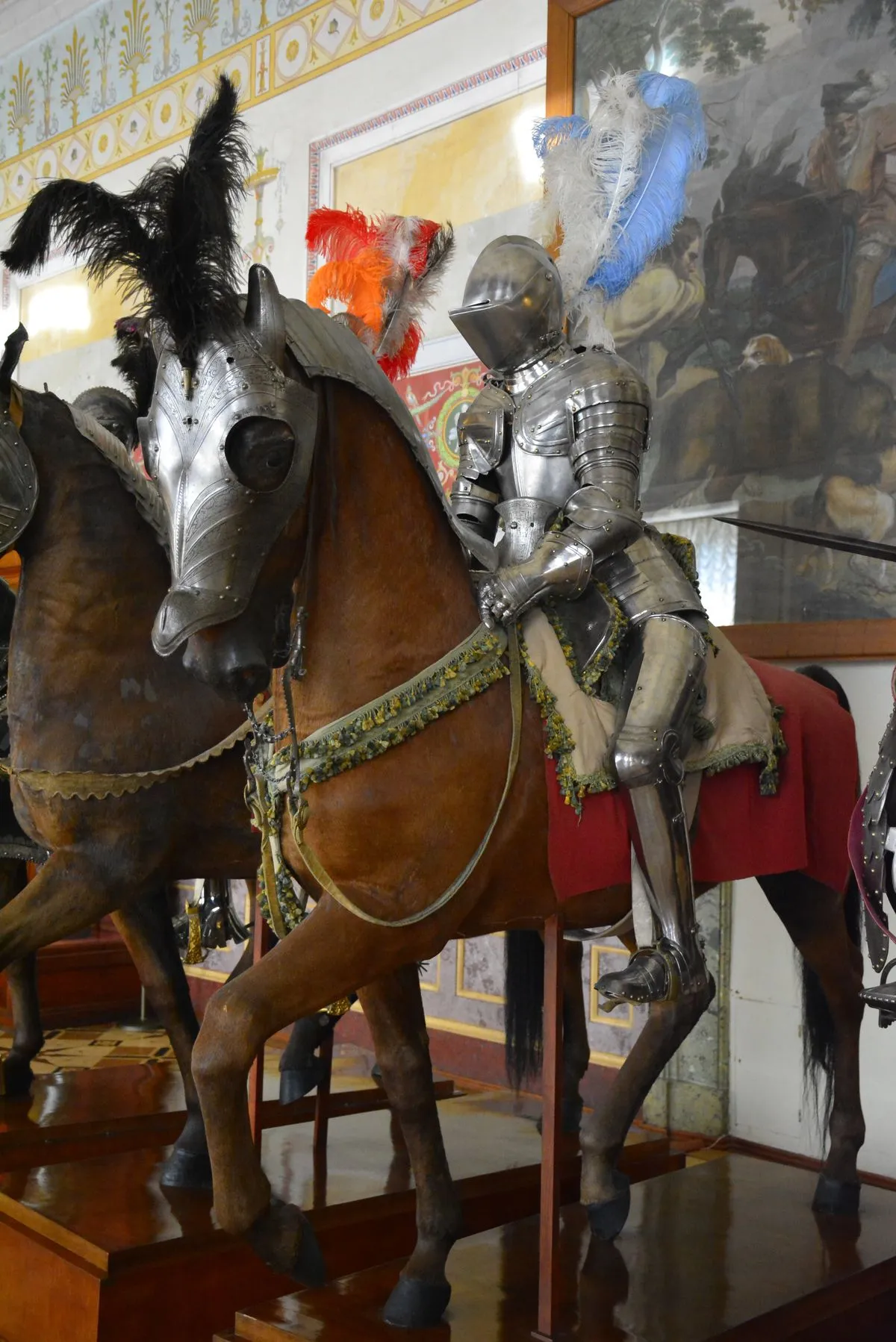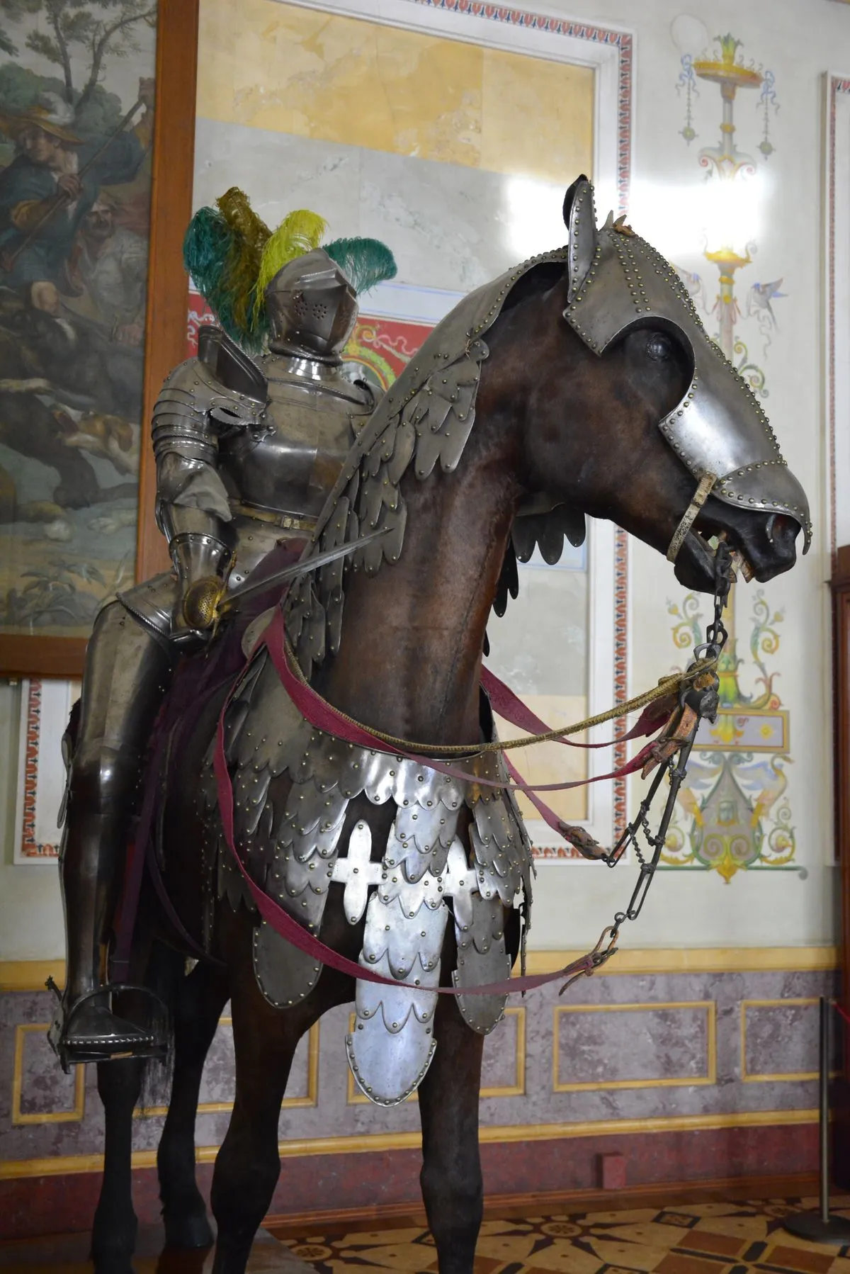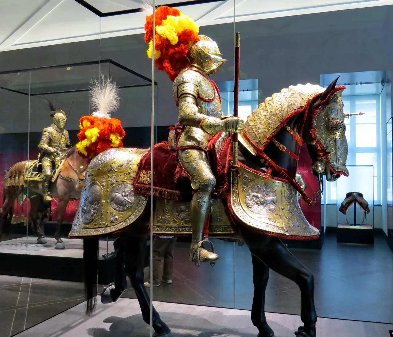 Один из залов Придворной охотничьей и оружейной палаты Художественно-исторического музея Вены, во дворце Новый Хофбург. На переднем плане гарнитур для всадника и его коня, принадлежавший императору Фердинанду I. Интересен он тем, что мог использоваться и в качестве боевого, и в качестве турнирного. Края отделаны золотом на синем фоне, с изображением завитков, трофеев, сказочных животных и фигур людей. Изготовил их Кольман Хельмшмид (1471–1532) из Аугсбурга. Материалы и технологии изготовления: рифлёное кованое железо, золото, латунь, кожа. Доспехи изготовлены в позднеготическом стиле в 1526 году. Вес полного доспеха всадника — около 25 кг. Интересно, что сам Фердинанд I в реальных боях эти доспехи никогда не надевал