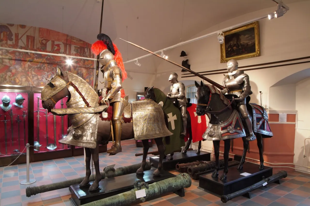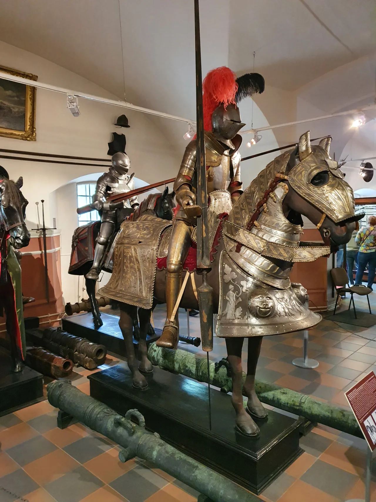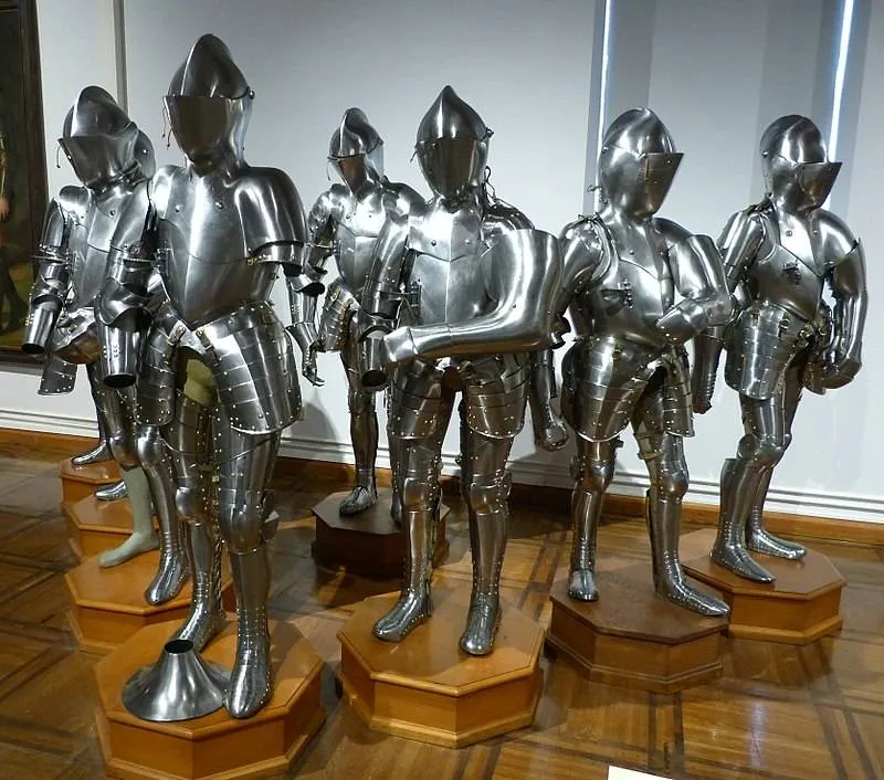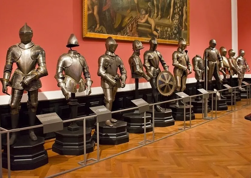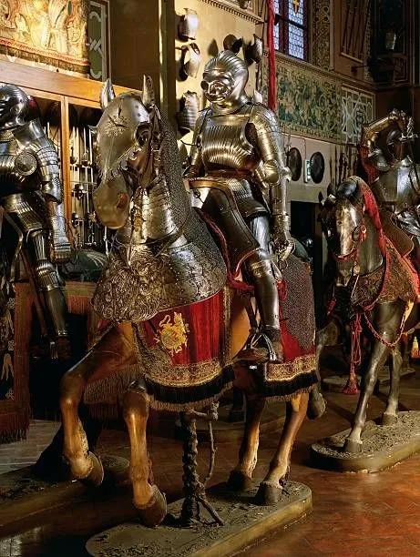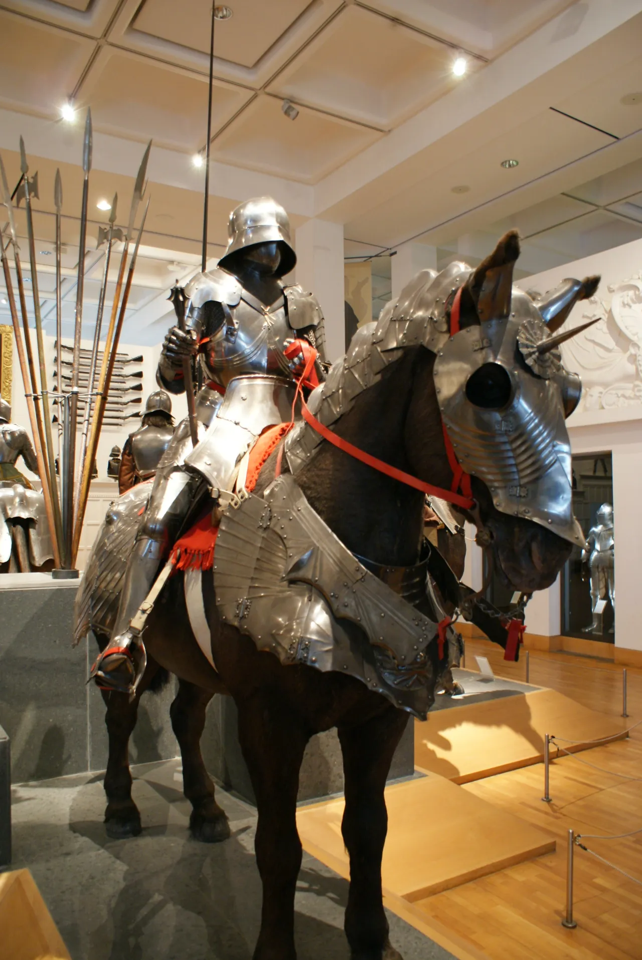 Один из залов Придворной охотничьей и оружейной палаты Художественно-исторического музея Вены, во дворце Новый Хофбург. На переднем плане гарнитур для всадника и его коня, принадлежавший императору Фердинанду I. Интересен он тем, что мог использоваться и в качестве боевого, и в качестве турнирного. Края отделаны золотом на синем фоне, с изображением завитков, трофеев, сказочных животных и фигур людей. Изготовил их Кольман Хельмшмид (1471–1532) из Аугсбурга. Материалы и технологии изготовления: рифлёное кованое железо, золото, латунь, кожа. Доспехи изготовлены в позднеготическом стиле в 1526 году. Вес полного доспеха всадника — около 25 кг. Интересно, что сам Фердинанд I в реальных боях эти доспехи никогда не надевал