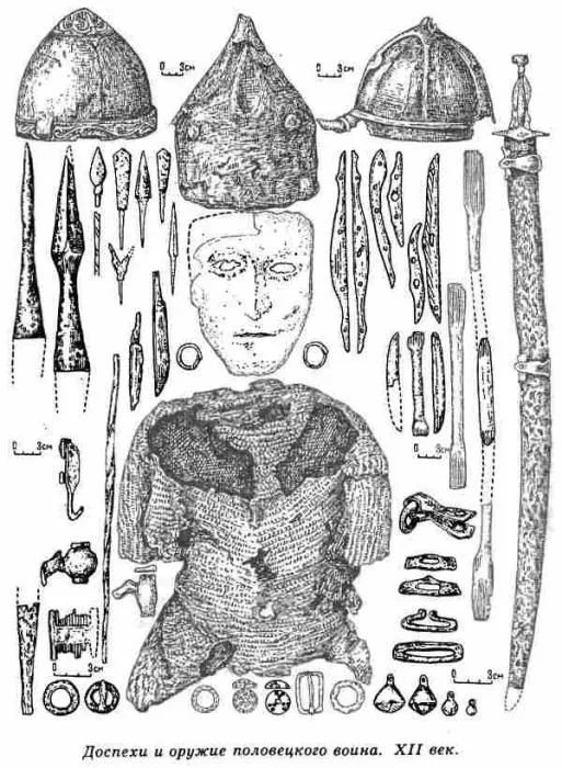 Вооружение и доспехи половецких воинов — кольчуги, шлемы, личины, наконечники копий и стрел, рогатины, чеканы, топоры — не отличаются от подобных предметов из вооружения русских дружинников-витязей того же или более раннего времени. Только слегка изогнутая сабля выдаёт в половце степного воина. Изогнутый облегчённый меч-сабля не есть изобретение тюрков или монголов. Сабля появилась в среде евразийских русов лесостепной зоны как более удобное оружие для конного боя. От русов это оружие распространилось по всей Евразии.
