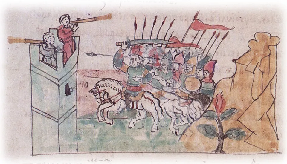 Подступ к городу Переяславцу и его взятие Святославом. Миниатюра Радзивилловской летописи