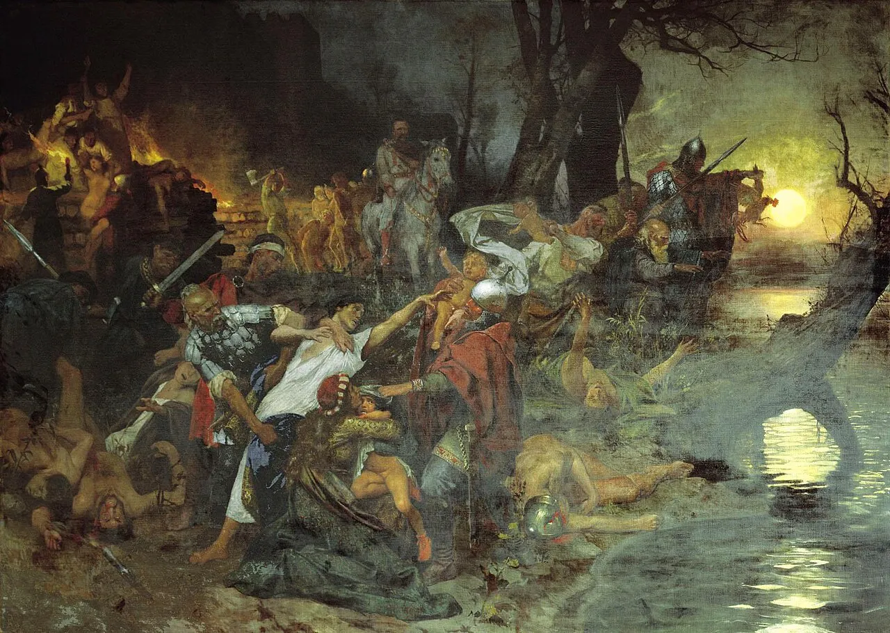 Генрих Семирадский. Тризна дружинников Святослава после боя под Доростолом в 971 году (Ночные жертвоприношения). 1884. Картина создавалась по греческим источникам, которые любили приврать о «русских варварах-скифах» и мешали правду с ложью. В хронике Льва Диакона рассказывается о кровавой битве под Доростолом: о многочисленных трупах, усеявших поле битвы, о жертвоприношениях пленных, в том числе женщин и детей, которых вместе с жертвенными петухами погружают в воды Дуная: «…когда наступила ночь и засиял полный круг луны, скифы вышли на равнину и начали подбирать своих мертвецов. Они нагромоздили их перед стеной, разложили много костров и сожгли, заколов при этом по обычаю предков множество пленных, мужчин и женщин. Совершив эту кровавую жертву, они задушили [несколько] грудных младенцев и петухов, топя их в водах Истра (Дуная)»