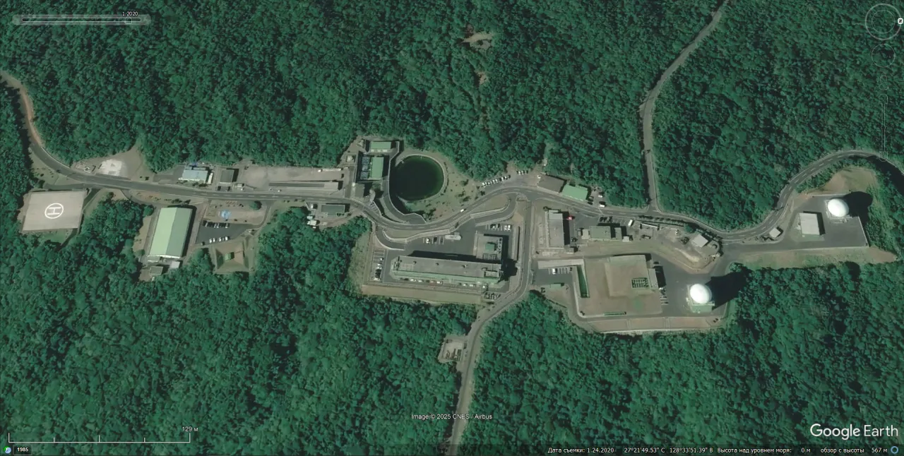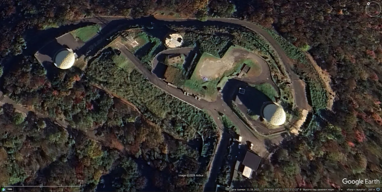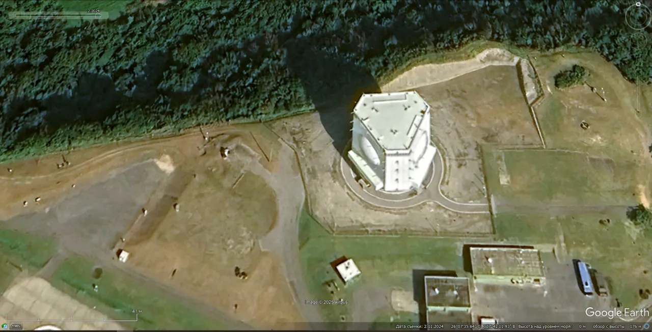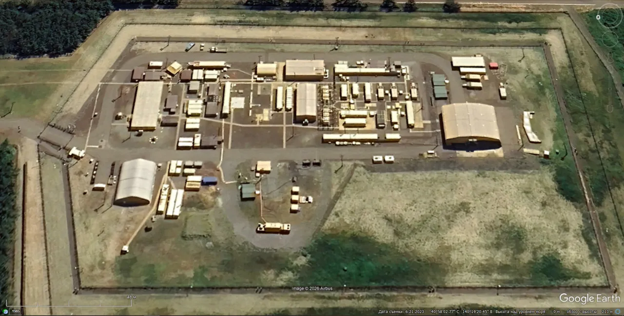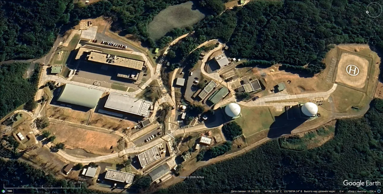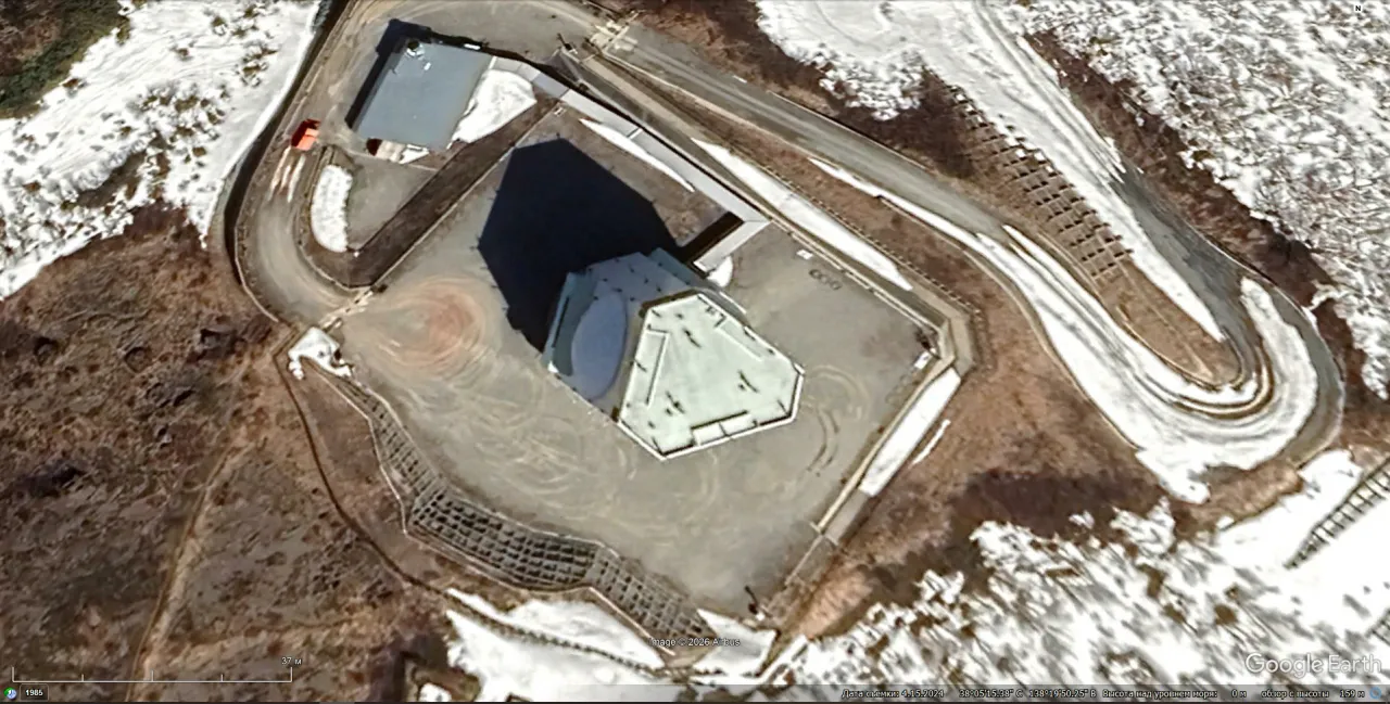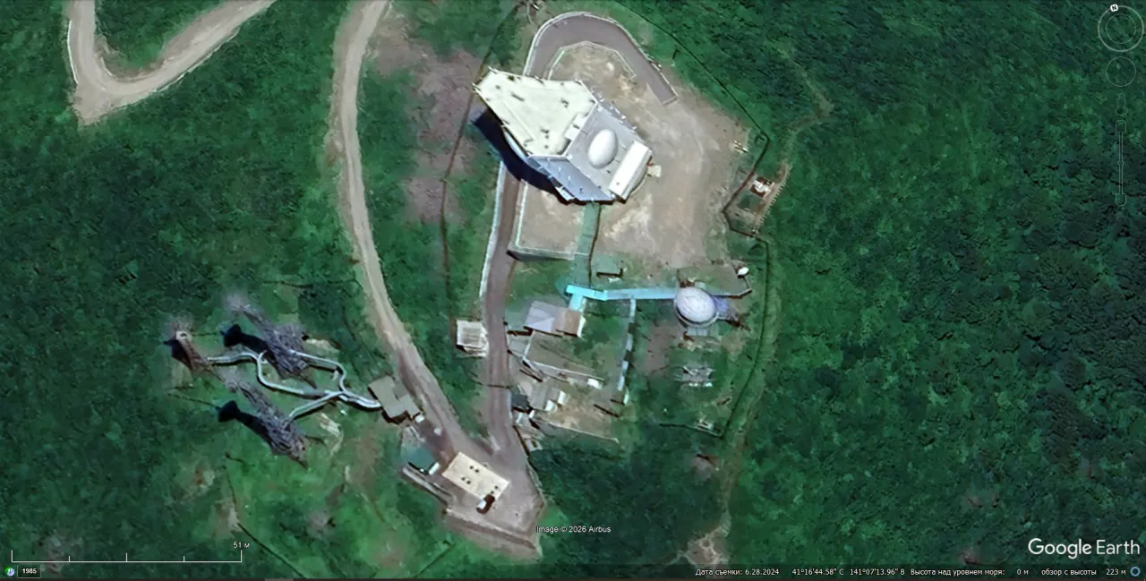 Спутниковый снимок GoogleEarth: радиолокационный пост с РЛС J/FPS-3 неподалёку от посёлка Ине. Снимок сделан в ноябре 2025 года