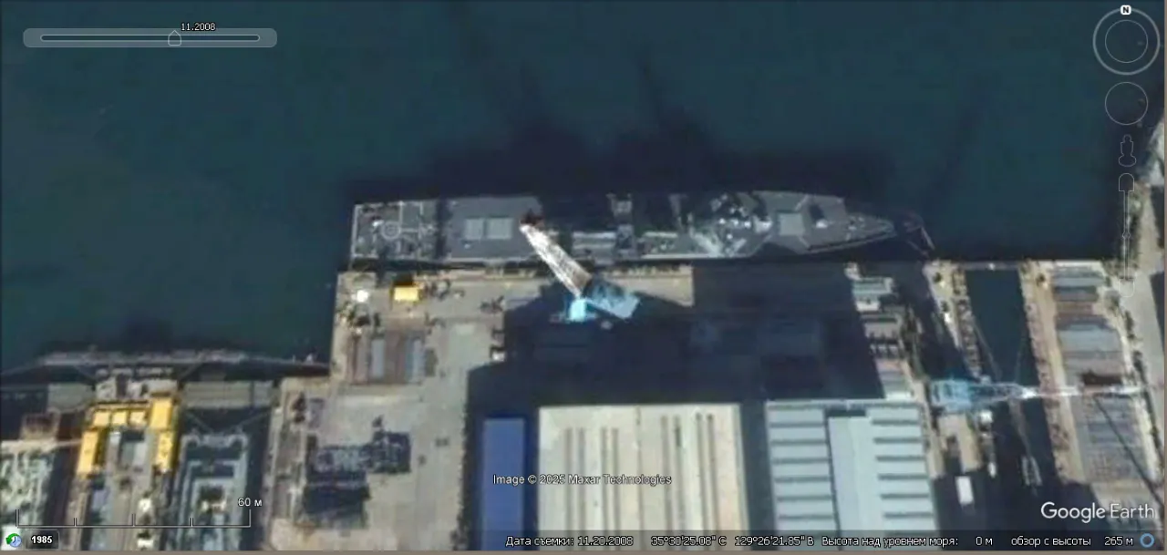 Спутниковый снимок GoogleEarth: эсминец «Сечжон Великий» (DDG-991) у достроечной стенки на верфи в городе Ульсан. Снимок сделан в ноябре 2008 года