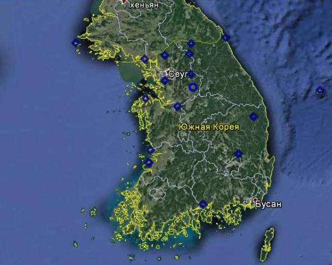 Схема размещения стационарных радиолокационных постов на территории Республики Корея