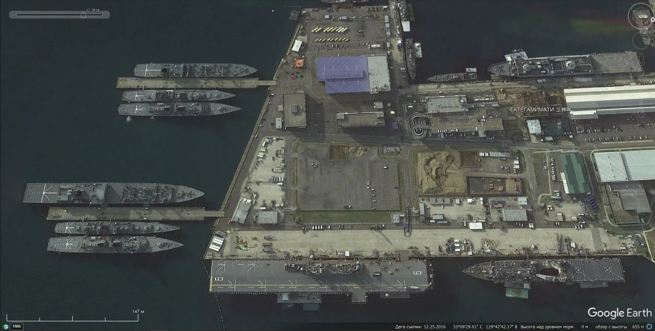 Спутниковый снимок GoogleEarth: боевые корабли Морских Сил самообороны Японии и ВМС США на стоянке военно-морской базы Сасебо. Снимок сделан в декабре 2016 года
