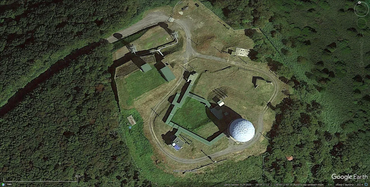 Спутниковый снимок GoogleEarth: РЛС J/FPS-5 в 3 км западней города Муцу в префектуре Аомори. Снимок сделан в июне 2024 года