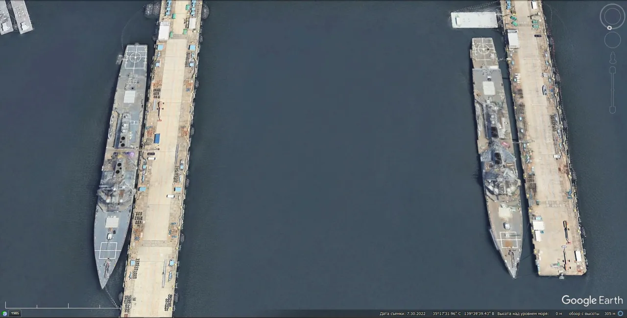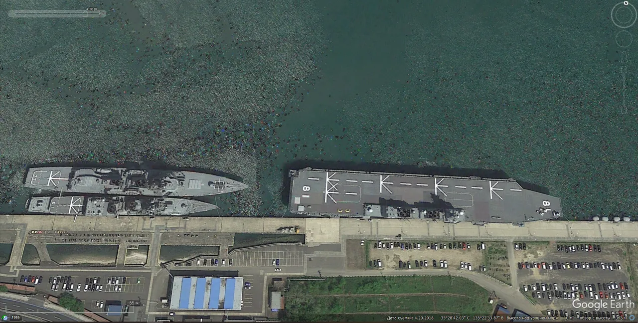 Спутниковый снимок GoogleEarth: эсминец УРО «Атаго» (DDG-177), эсминец «Асагири» (DD-151) и эсминец (вертолётоносец) «Хюга» (DDH-181) на стоянке военно-морской базы Майдзуру в префектуре Киото. Снимок сделан в апреле 2018 года