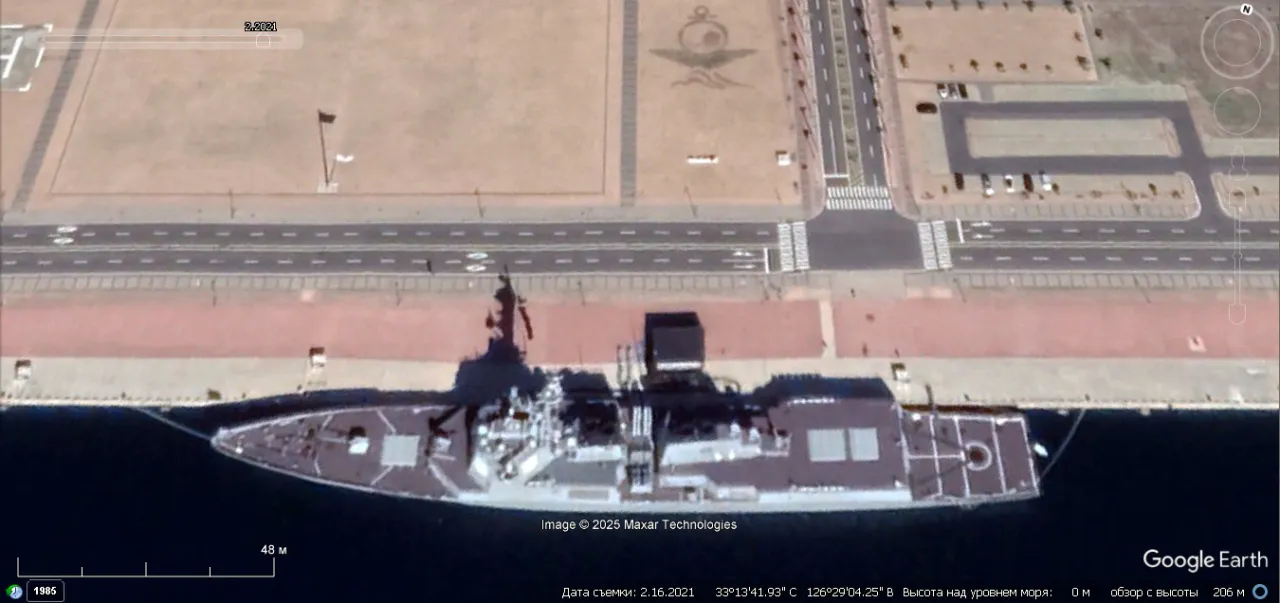 Спутниковый снимок GoogleEarth: эсминец типа «Сечжон Великий» на стоянке военно-морской базы Чеджу. Снимок сделан в феврале 2021 года