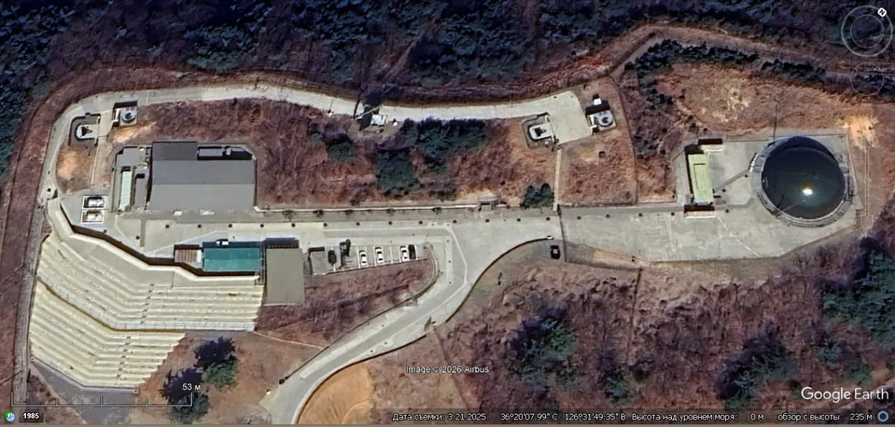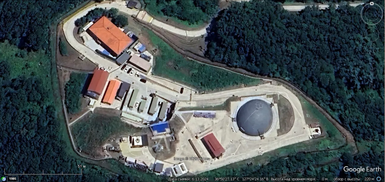 Спутниковый снимок Google Earth: эта же РЛС EL/M-2080 Green Pine на побережье северней порта Порён с антенной укрытой радиопрозрачным куполом. Снимок сделан в марте 2025 года