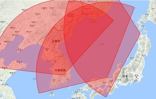 Сектора просмотра РЛС AN/TPY-2, развёрнутых в Японии и в Южной Корее