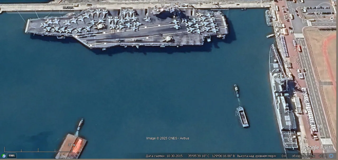 Спутниковый снимок GoogleEarth: эсминец типа «Сечжон Великий» и американский авианосец «Рональд Рейган» (CVN-76) на стоянке военно-морской базы Пусан. Снимок сделан в октябре 2015 года