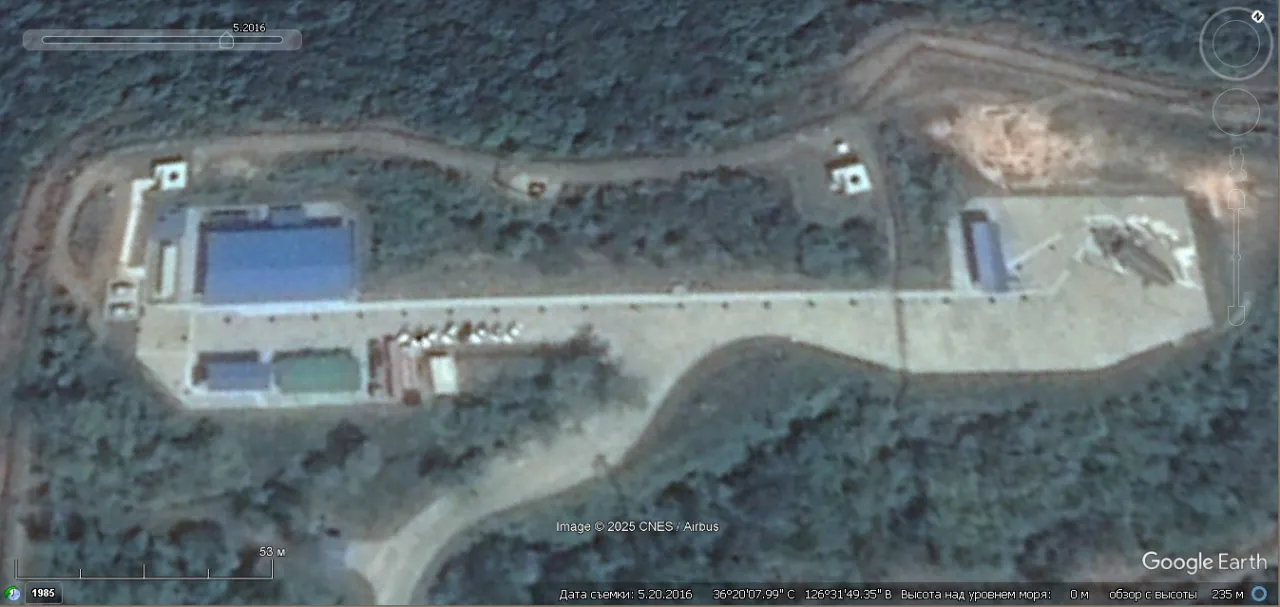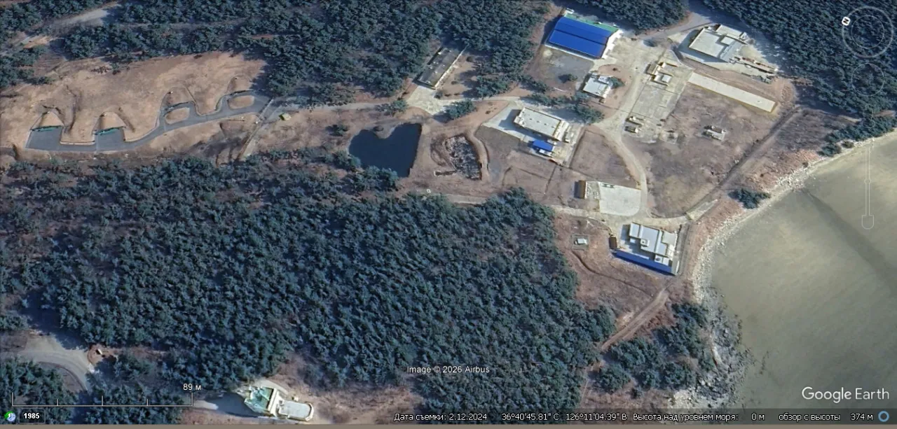 Спутниковый снимок Google Earth: РЛС EL/M-2080 Green Pine на побережье северней порта Порён. Снимок сделан в апреле 2016 года