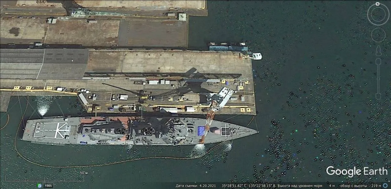 Спутниковый снимок GoogleEarth: эсминец УРО «Мёко» (DDG-175) на стоянке военно-морской базы Майдзуру в префектуре Киото. Снимок сделан в апреле 2020 года