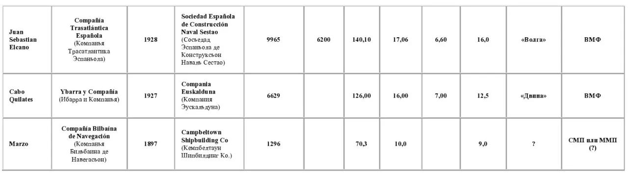 В 1938–39 гг. девять торговых судов сменили флаги Испанской республики на советские (см. таблицу). В их число входили и грузопассажирские суда, в том числе лайнеры, осуществлявшие регулярные рейсы в порты Южной Америки. Писать об этих судах очень сложно. Конечно, проще всего обратиться к архивам, но, увы, это не всем доступно. В печатных публикациях и в сетях Интернета, как российских, так и испанских, сведения весьма противоречивы и обычно довольно фантастичны. Поэтому постараюсь придерживаться наиболее вероятной (по мнению автора) истории этих судов.