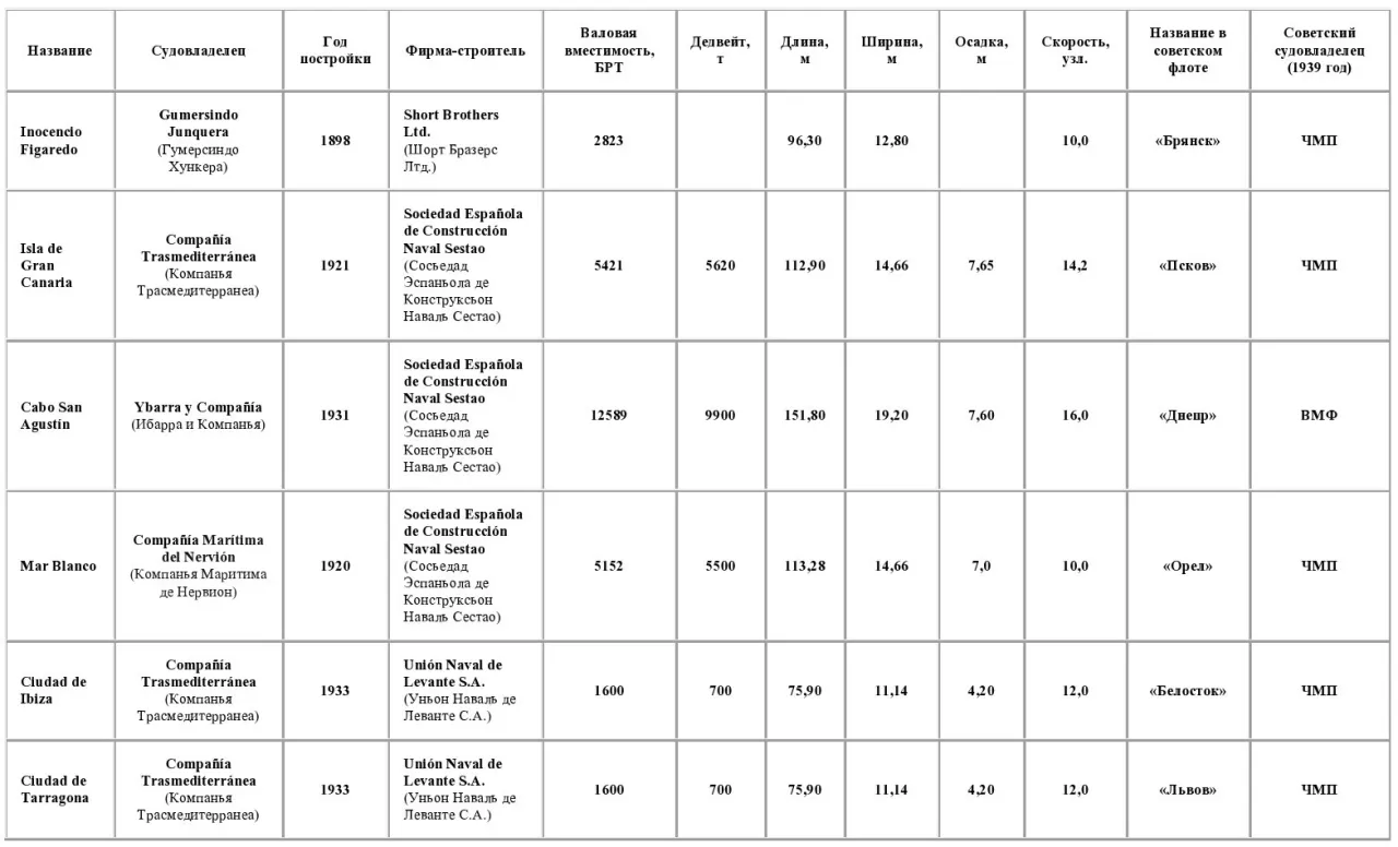 Испанские суда, реквизированные в советских портах в 1938-1939 гг. (9 судов тоннажом 47075 BRT)