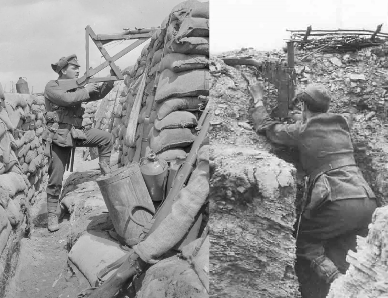 Британский самопал для стрельбы из окопа в 1915 году и немецкий серийный Deckungszielgerät на фронтах Второй мировой. Хотя фактически это системы из разных эпох, между ними почти 30 лет, выполнены они на разных технологических уровнях, принцип абсолютно тот же, а боевая эффективность не сильно отличается. Такие перескопные винтовки появлялись у англичан в 1915 году на разных участках фронта абсолютно независимо друг от друга, и долгое время они существовали только в виде фронтовых самоделок разного технологического уровня. Классический пример фронтовой инициативы снизу.