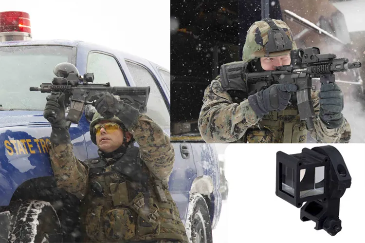 Прицел для стрельбы из-за укрытия Accutact Anglesights. Главный плюс – простота и дешевизна, минусы всё те же – весьма условно прицельная стрельба, и руки вы всё равно подставите под огонь противника. К прицелу присматривались американские военные, но потестировали и отказались. В результате он лишь ограниченно закупается различными американскими правоохранителями