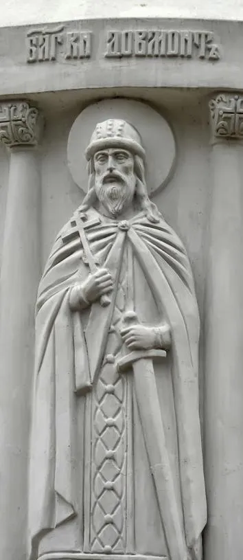 Довмонт, литовец по происхождению, псковский князь, ставший святым Русской Православной Церкви на постаменте памятника княгине Ольге в Пскове
