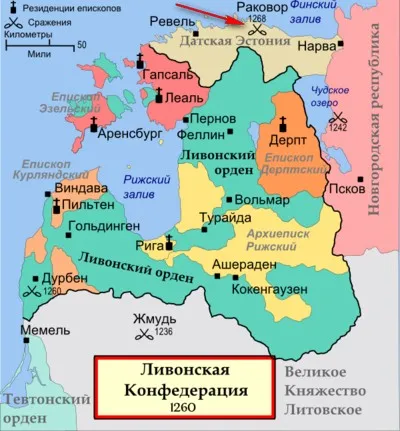 Север Ливонии в те времена контролировали «мужи короля» Дании, которым принадлежали города Ревель (Колывань, современный Таллин – буквально «Датский город») и Везенберг (Раковор, Раквере), а также территория вдоль южного берега Финского залива от реки Нарва до Рижского залива (на глубину до 50 км). В центральной и южной Ливонии и в Латгалии находились владения Ордена и ливонских архиепископов – причем отмечалась чересполосица. Рига, Дерпт (Юрьев, Тарту), Оденпе (Медвежья Голова, Отепя), Гапсаль (Хапсалу) принадлежали архиепископу Риги, Венден (Цесис), Феллин (Вильянди) и другие области – Ордену.