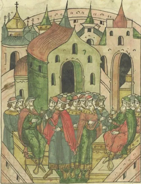 Новгородцы отдают посадничество Михалку Фёдоровичу, а тысячничество Жидяте Доможировичу. Миниатюра Лицевого летописного свода, 70-е гг. XVI в.