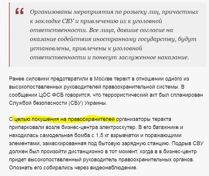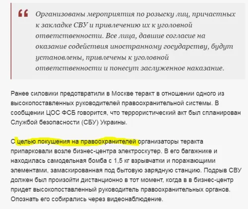 Ранее силовики предотвратили в Москве теракт в отношении одного из высокопоставленных руководителей правоохранительной системы. В сообщении ЦОС ФСБ говорится, что террористический акт был спланирован Службой безопасности (СБУ) Украины.