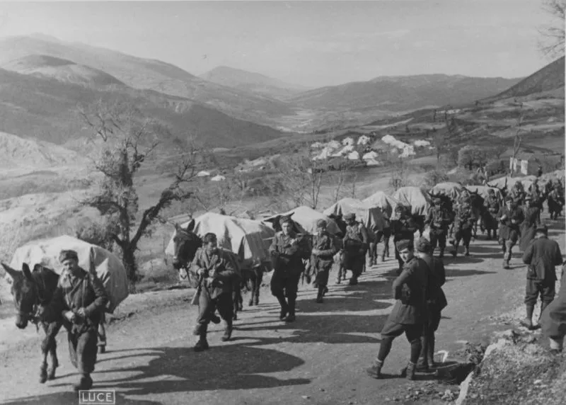 Колонна итальянских солдат с вьючными животными на дороге в горах Греции. 1941 год
