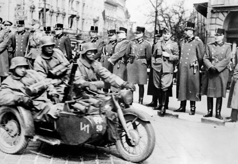 Мотоциклисты моторизованной дивизии СС «Рейх» на мотоцикле BMW R12 движутся мимо строя офицеров венгерской армии через Будапешт для вторжения в Югославию. Апрель 1941 года