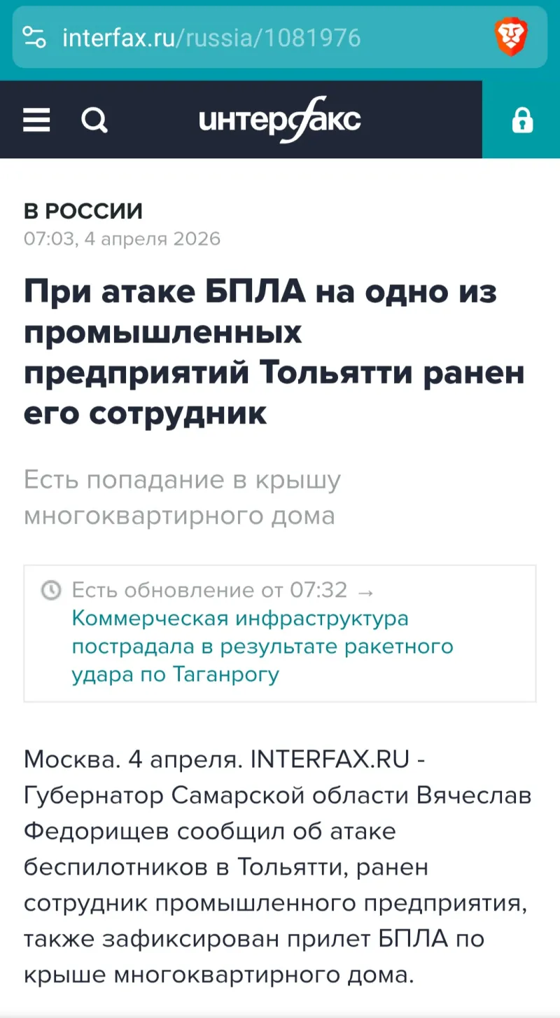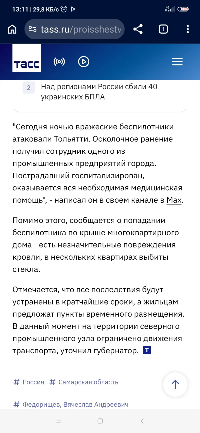 Губернатор Самарской области Вячеслав Федорищев написал в своем аккаунте мессенджера МАХ, что ночью вражеские дроны атаковали одно из промышленных предприятий города Тольятти. В области ночью был введен режим «Ковер», означающий перекрытие воздушного пространства для гражданской авиации.