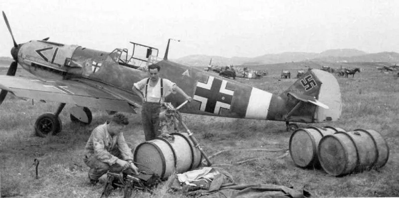 Немецкий самолет-истребитель Мессершмитт Bf.109E7 из 27-й истребительной эскадры (JG-27) на аэродроме. Апрель 1941 года, Балканы