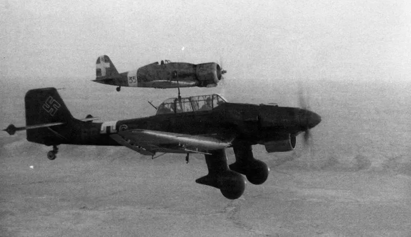 Немецкий пикирующий бомбардировщик Ю-87 летит в сопровождении итальянского истребителя G.50 «Freccia»