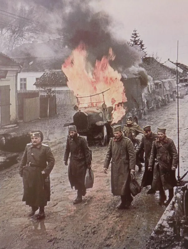 Югославские военнопленные проходят рядом с горящим грузовиком на улице города Ниш