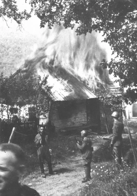 Итальянские солдаты на улице горящей югославской деревни Риека
