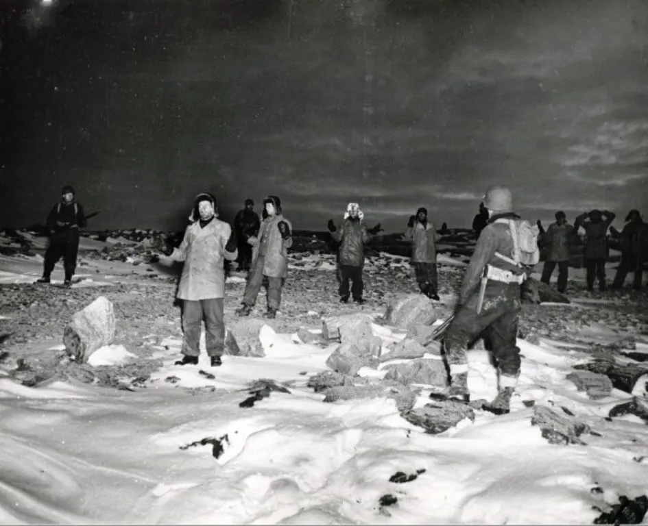 Персонал метеостанции Edelweiß II сдается морякам Береговой охраны США (Гренландия, 1944)