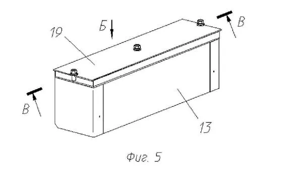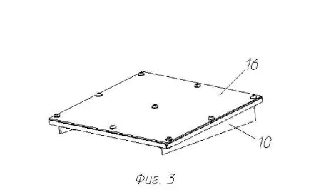 Модуль первого типа (в патенте — первого комплекта) для защиты надгусеничных полок танка в носовой части. 16 — крышка , 10 — защитный модуль первого комплекта.