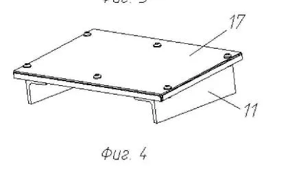 Модуль второго типа (в патенте — второго комплекта) для защиты надгусеничных полок танка в носовой части. 17 — крышка , 11 — защитный модуль второго комплекта.