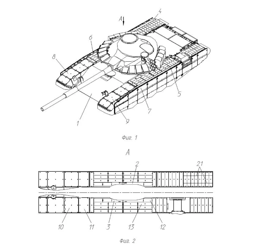 1 — танк, 2 — правая надгусеничная полка, 3 — левая надгусеничная полка, 4 — правый фальшборт, 5 — левый фальшборт, 6 — правый экран встроенной бортовой динамической защиты (штатный), 7 — левый экран встроенной бортовой динамической защиты (штатный), 8 — динамическая защита в переднем отсеке правой полки (штатная), 9 — динамическая защита в переднем отсеке левой полки (штатная), 10 — защитный модуль первого комплекта, 11 — защитный модуль второго комплекта, 12 — защитный модуль четвёртого комплекта, 13 — защитный модуль третьего комплекта, 21 — скрепляющая проволока