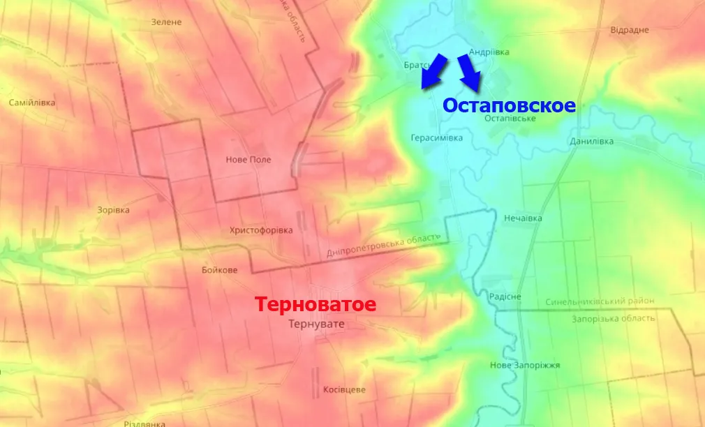 Накануне в результате атак в районе населённого пункта Остаповское противнику удалось взять под контроль порядка 5 квадратных километров территории в Днепропетровской области. Таким образом противник, вернув контроль над Остаповским, обозначает свои намерения по обходу Терноватовской гряды с севера, с попыткой зайти в тыл нашим войскам, контролирующим запорожское село Терноватое.
