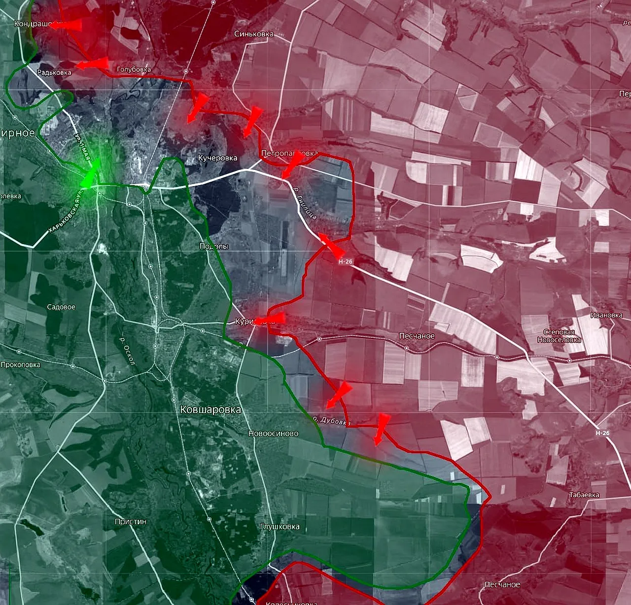 Наши бойцы предпринимают штурмовые действия и в районе поселка городского типа Ковшаровка. Он расположен на левом берегу реки Оскол, выше по течению на расстоянии в 1,5 км к югу от важного логистического центра — пгт Купянск-Узловой.