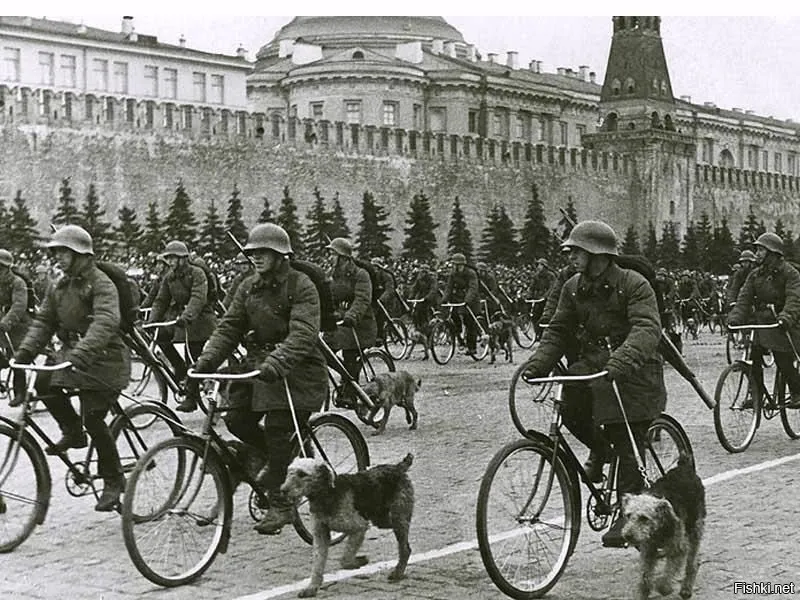 Сапёры-самокатчики РККА с минно-розыскными собаками прошли по Красной площади на параде 1938 года. В Великую Отечественную велосипеды не получили массового распространения – промышленность не могла позволить их производство. Пополняли запасы в основном трофейными.